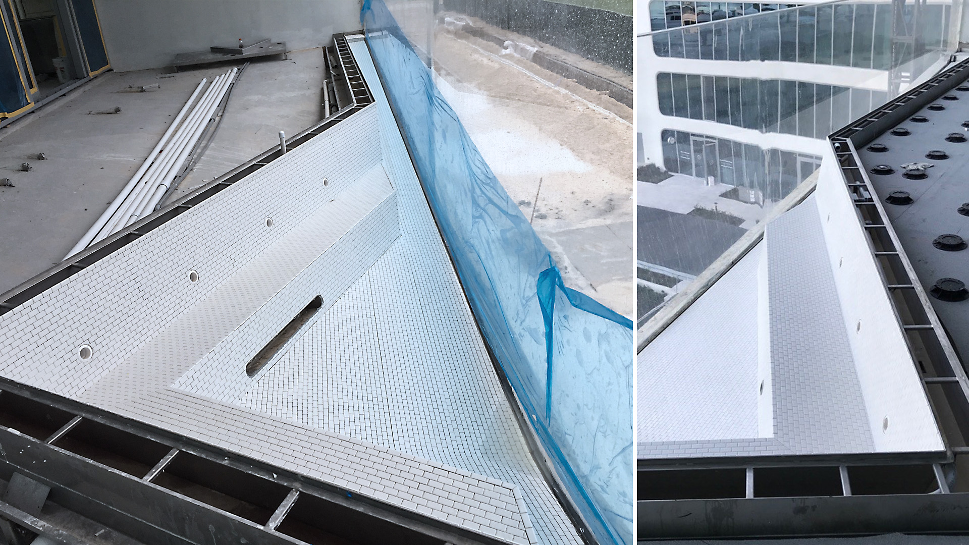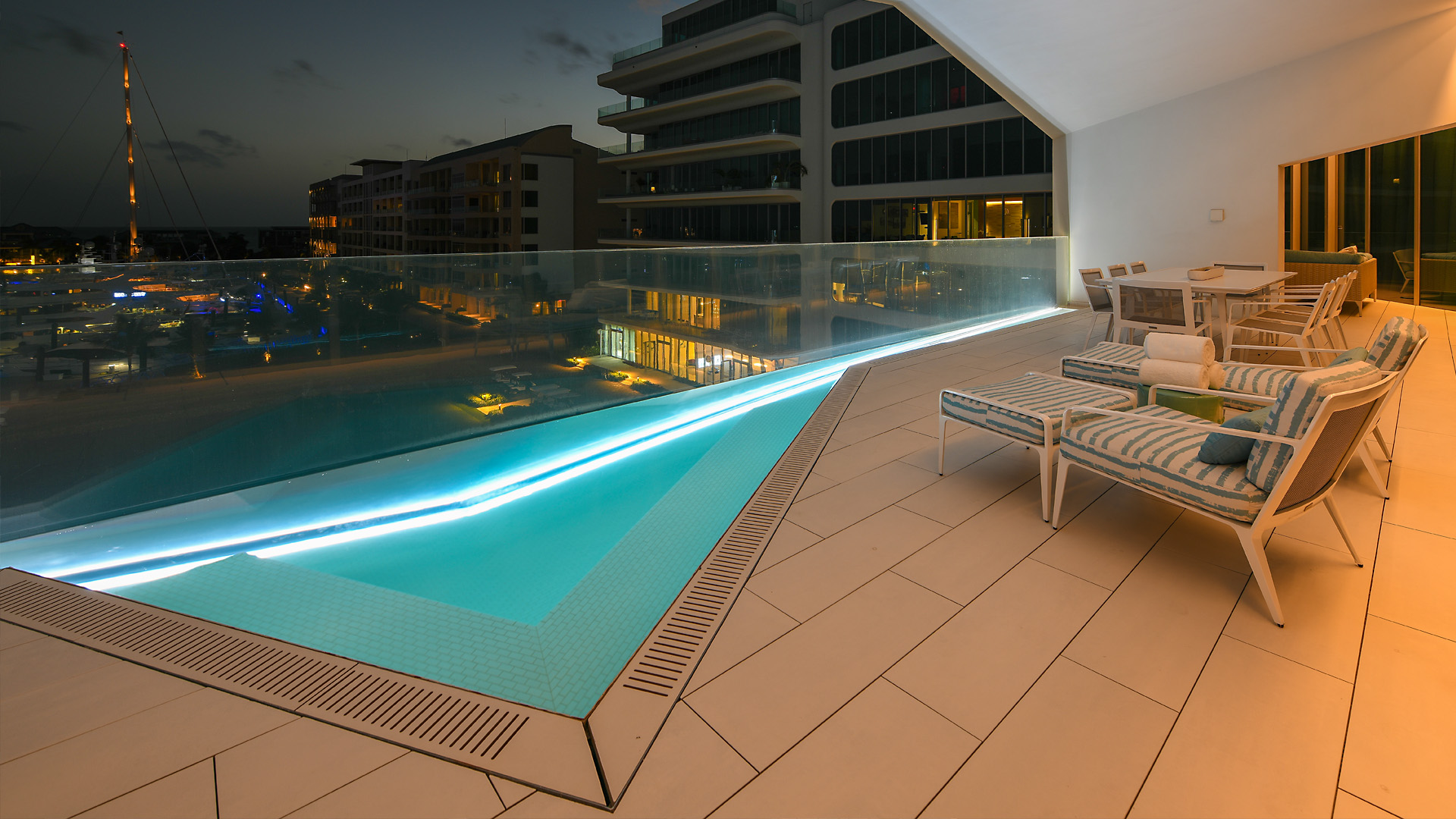 Elegantly designed to vanish into the architecture, the acrylic face of each pool spans the entire length of the balcony creating unbroken views of the marina from inside the unit. With a total of four design shapes, every in-suite pool was pre-fabricated at Bradford, shipped to the Bahamas, craned into place, water tested, and tiled onsite. To further elevate the experience, we designed in bench seating and soothing hydrotherapy jets, along with interior lighting to illuminate at night.